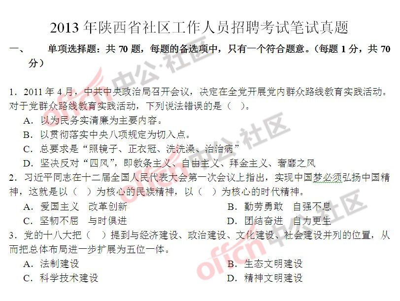 2014年陕西省社区工作者招聘公告已经发布,中公社区工作者考试网为方便大家备考提供:2013年陕西社区工作者考试试题,帮助各位考生理解考试题型,了解自身复习的薄弱环节,争取在社区工作者考试中致胜。