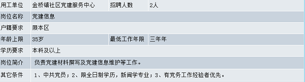 2017上海浦东新区金桥镇社区工作者招聘67人职位表