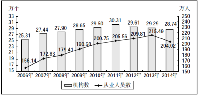图 2006-2014年全国文化单位机构数及从业人员数