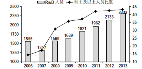 2013年,贵州省政府研究机构R&D人员2333人,比上年同期增长9.4%,是2006年的1.5倍。R&D人员中具有硕士及以上学历的人员比重不断提高,截止2013年末,具有硕士及以上学位的人员为1004人,占全省政府研究机构R&D人员的比重为43.0%,比上年同期提高0.6个百分点,比2006年提高28.7个百分点。