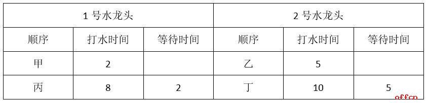 中公解析:对于这么一个题目,只是水龙头的数量发生了变化,打水时间固定,那么要使时间之和最短,还是应该先安排时间比较短的人先打水。此时因为有两个水龙头,也可以列表去对比打水和等待时间。