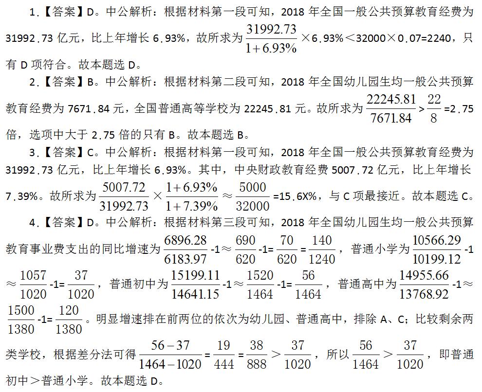 验证:C项,根据材料第三段可知,2018年全国普通初中生均一般公共预算教育事业费支出为15199.11元,其中,农村为13912.37元。那么全国普通初中的数值-农村普通初中的数值为15199.11-13912.37=12XX元,小于全国普通初中数值的10%(1519.911元),那么农村普通初中的占比大于90%,说法正确。