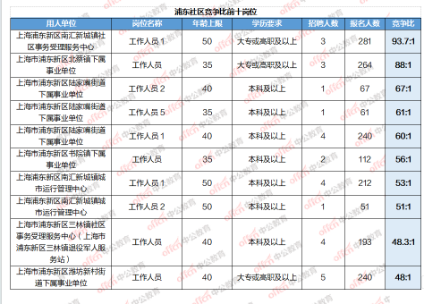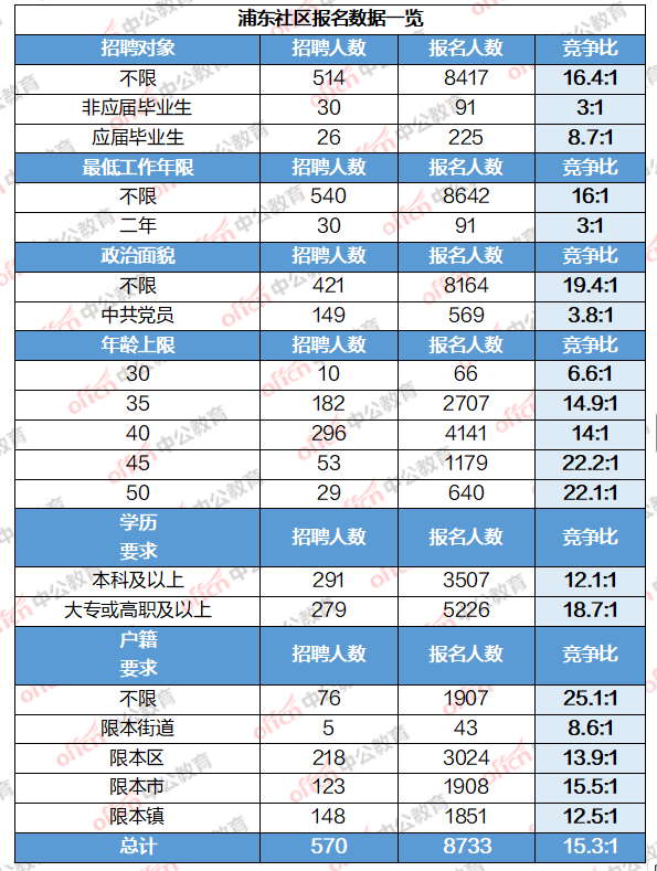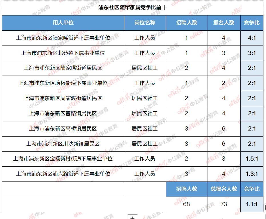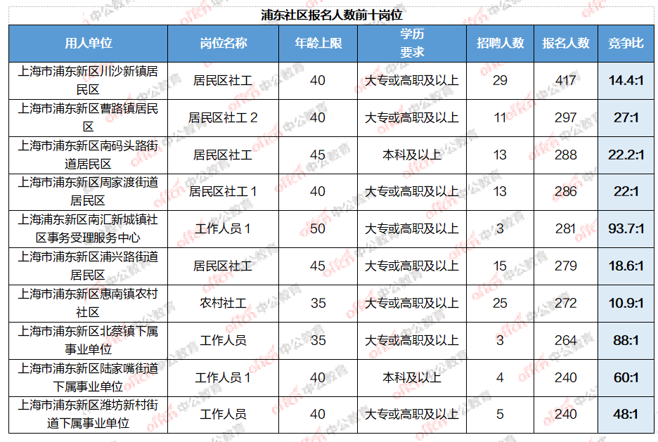 2025上海浦东新区社区工作者招638人!普通岗 570人(应届生不限户籍)+ 随军家属专项68人(学历放宽至大专)已于7日开始报名!现上海中公教育汇总16时报名数据帮助考生了解最新竞争比情况,截止16时上海社区总报名人数8733人竞争比最高岗位为上海浦东新区南汇新城镇社区事务受理服务中心工作人员1岗位总招聘3人已报名281人,竞争比为93.7:1