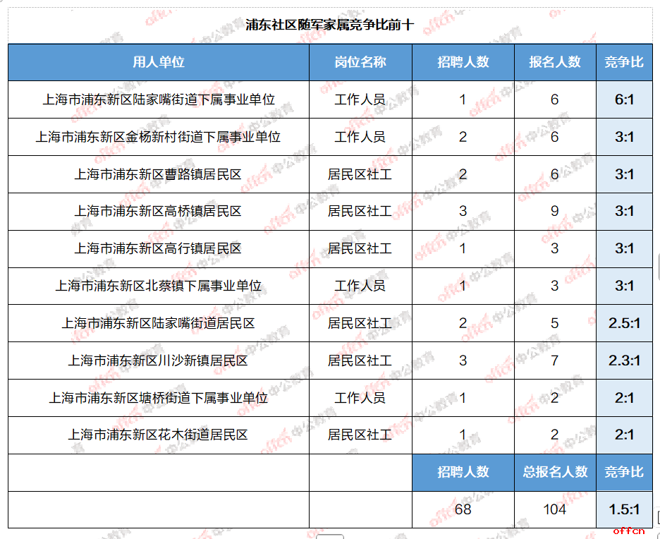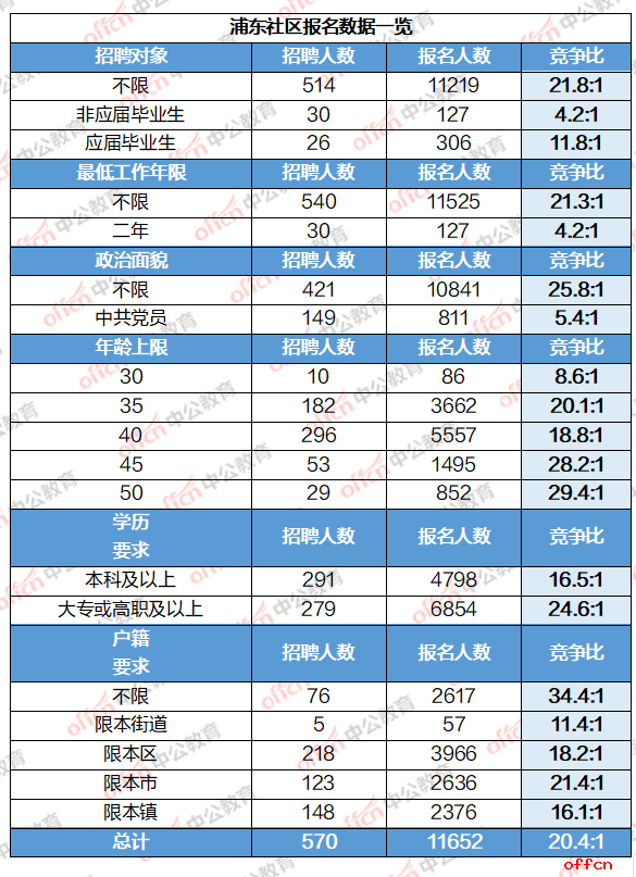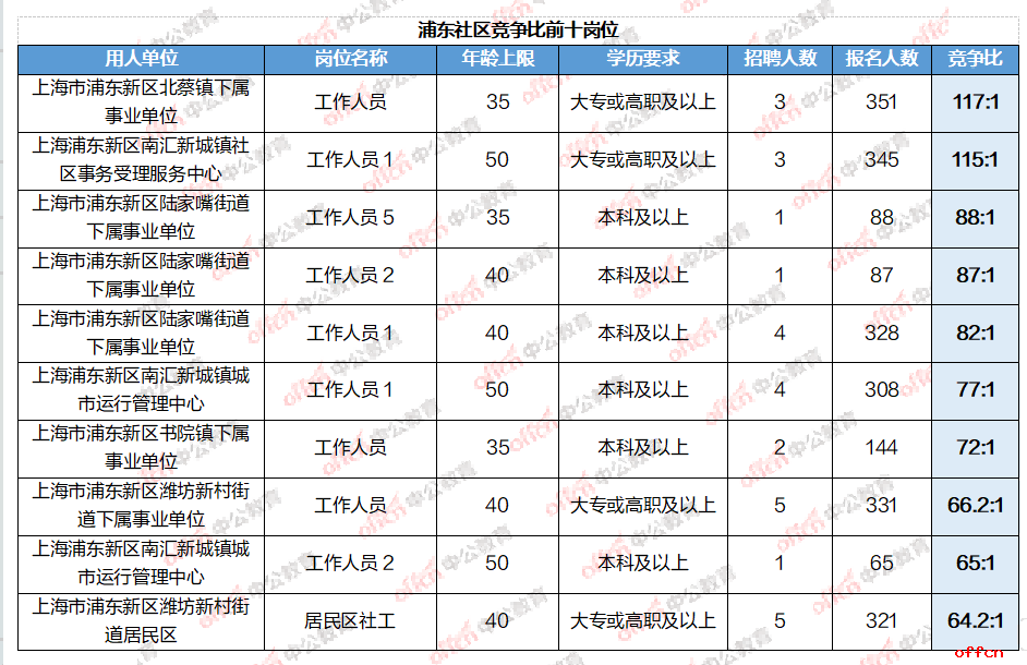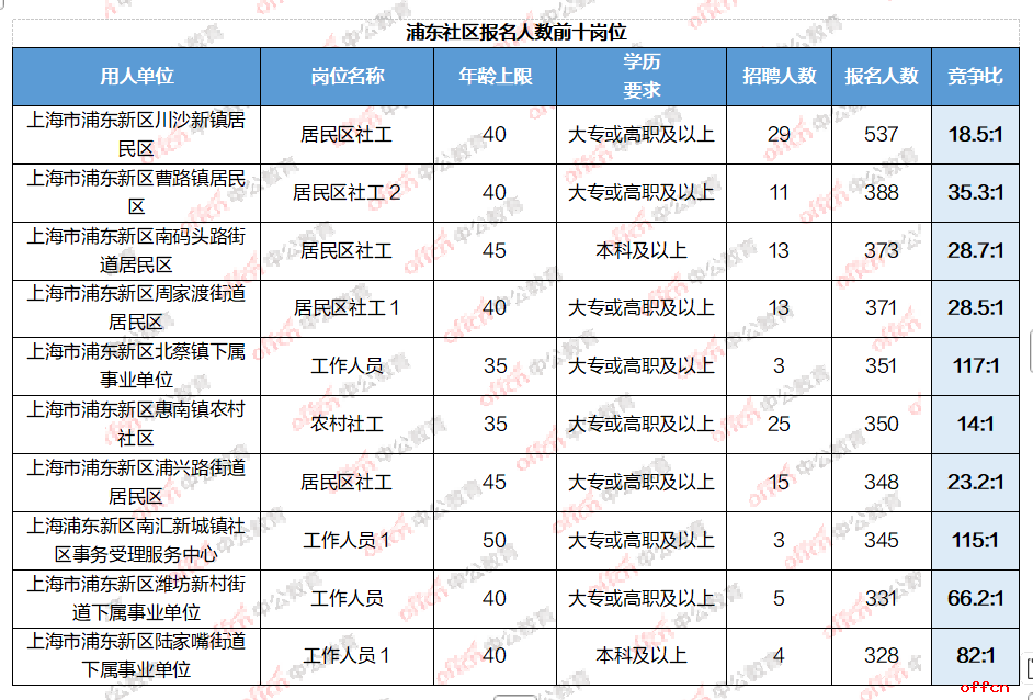 2025上海浦东新区社区工作者招638人!普通岗 570人(应届生不限户籍)+ 随军家属专项68人(学历放宽至大专)已于7日开始报名!现上海中公教育汇总16时报名数据帮助考生了解最新竞争比情况,截止16时上海社区总报名人数11652人竞争比最高岗位为上海浦东新区北蔡镇下属事业单位工作人员岗位总招聘3人已报名351人,竞争比为117:1