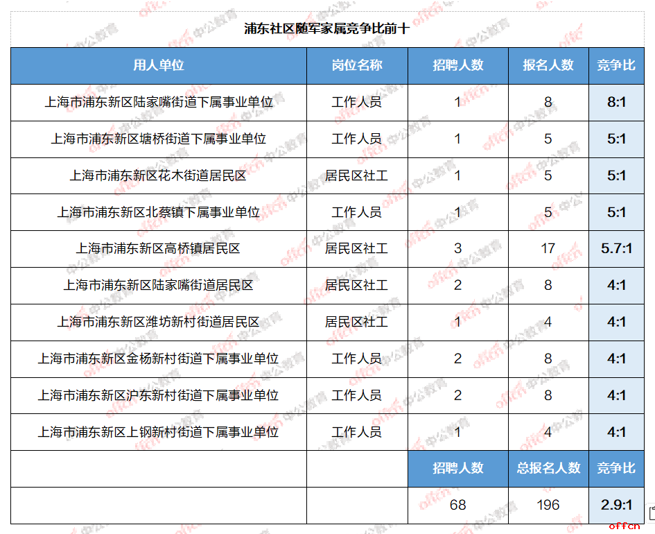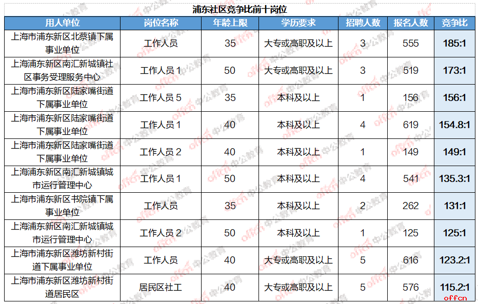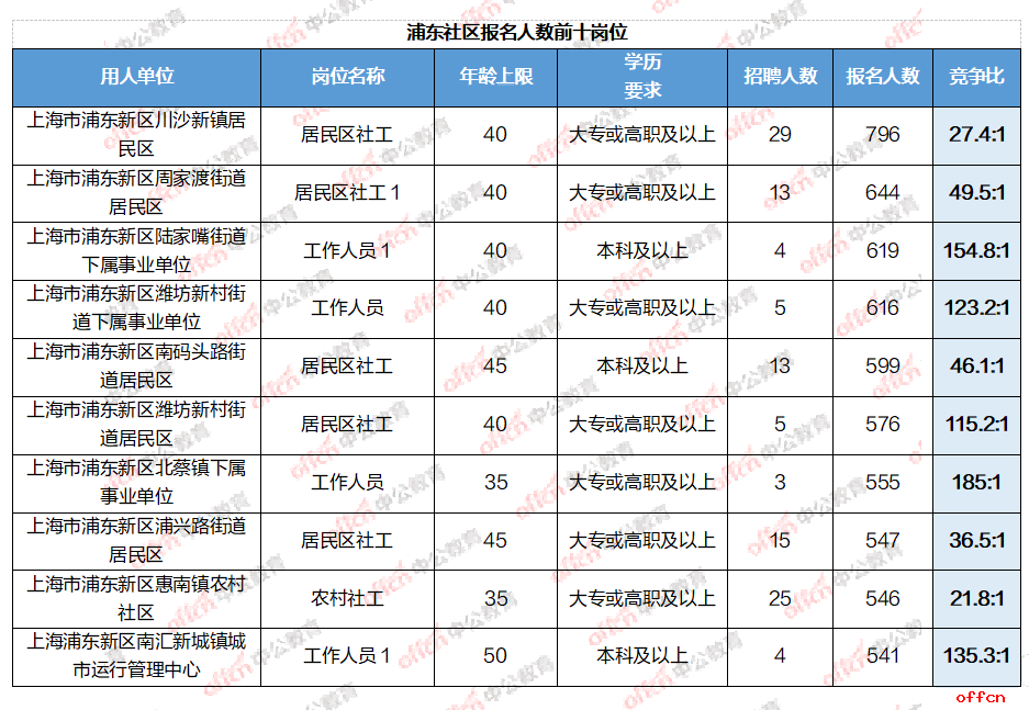 2025上海浦东新区社区工作者招638人!普通岗 570人(应届生不限户籍)+ 随军家属专项68人(学历放宽至大专)已于7日开始报名!现上海中公教育汇总16时报名数据帮助考生了解最新竞争比情况,截止16时上海社区总报名人数20282人竞争比最高岗位为上海浦东新区北蔡镇下属事业单位工作人员岗位总招聘3人已报名555人,竞争比为185:1