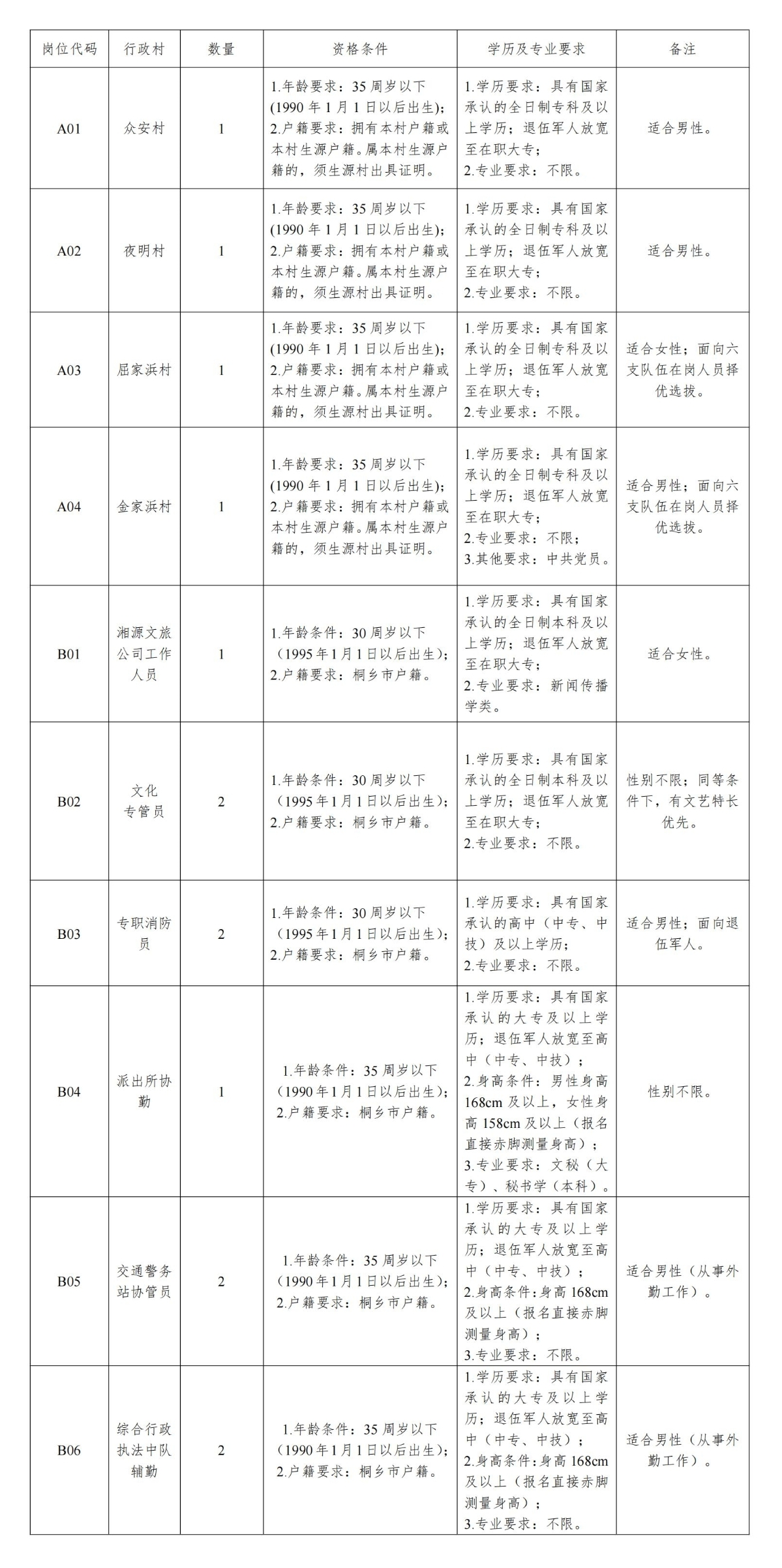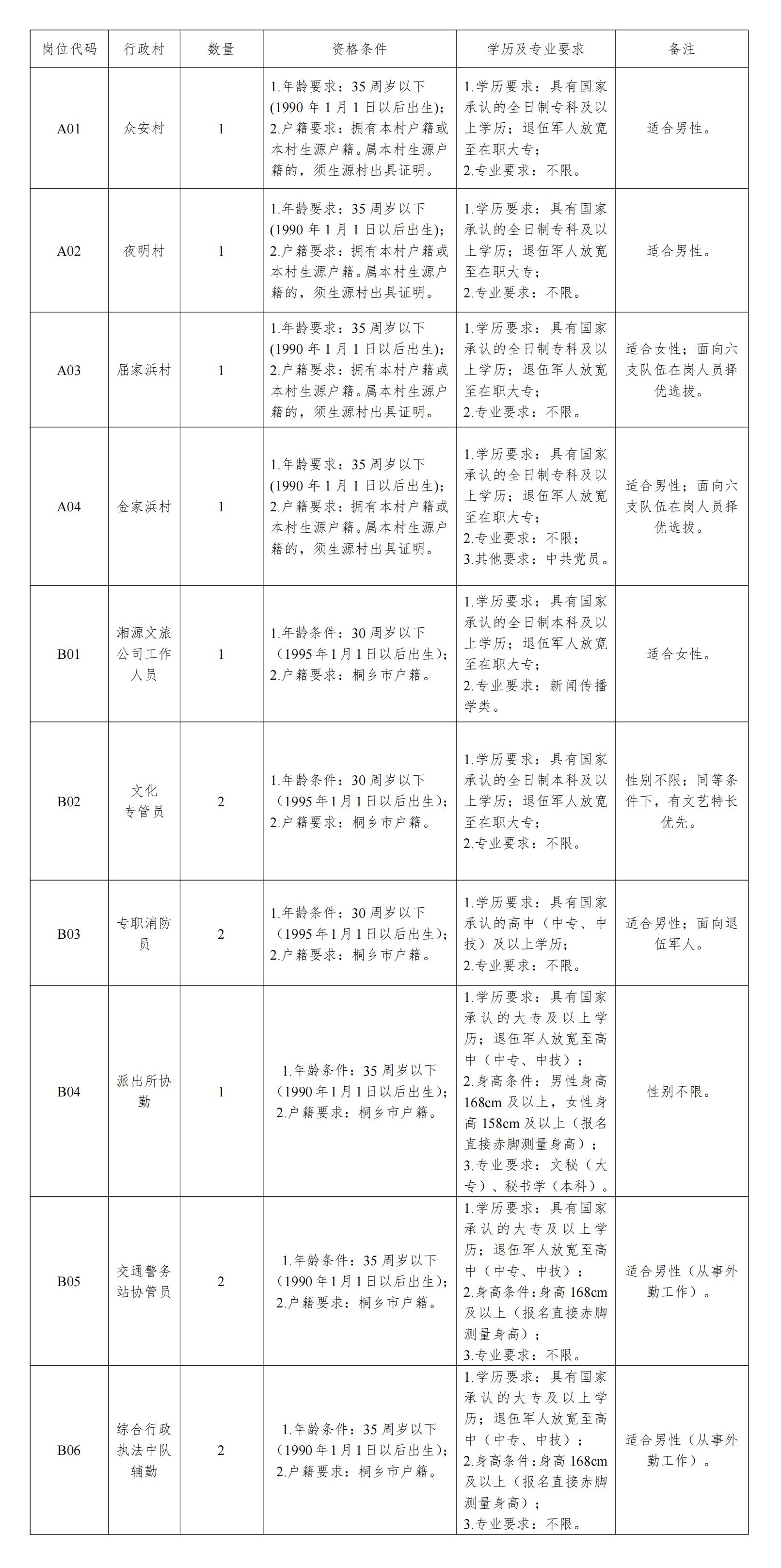 本次招考行政村后备干部4名,湘源文旅公司工作人员1名,文化专管员2名,专职消防员2名,派出所协勤1名,交通警务站协管员2名,综合行政执法中队辅勤2名。