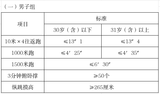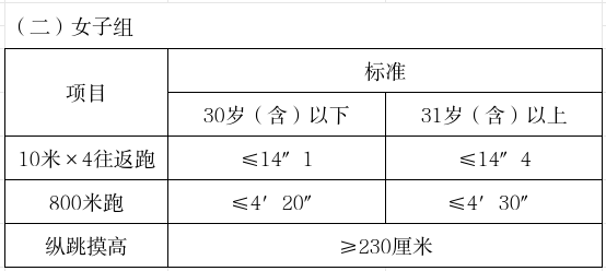2.体能测试。岗位B03、B04、B05和B06需要进行体能测试,B03测试项目为3分钟俯卧撑、1500M跑;B04测试项目为纵跳摸高、男子1000M跑(女子800M跑)、4×10M往返跑;B05测试项目为纵跳摸高、1000M跑;B06测试项目为1000M跑,具体标准见附件1。体能测试合格者方可进入笔试环节,体能测试不合格者取消资格。体能测试时间及地点另行通知。