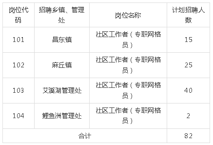 本次招聘社区工作者(专职网格员)共82名。其中昌东镇15名,麻丘镇25名,艾溪湖管理处40名,鲤鱼洲管理处2名。具体招聘岗位及人数如下: