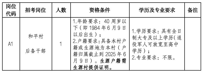 行政村后备干部应为屠甸镇和平村户籍人员(户籍归属时间截至为2025年6月9日)或本村生源户籍(生源户籍需相应村提供证明)。