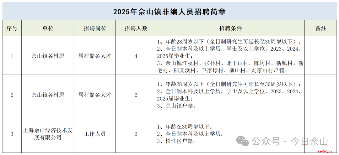 各招聘单位具体的岗位聘用要求、招聘条件等,详见《2025年佘山镇非编人员招聘简章》。