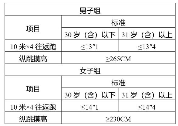 体测项目为纵跳摸高和10米×4往返跑,相关标准参照《公安机关录用人民警察体能测评项目和标准》。体能测评有一项不合格的,取消进入下一环节资格,报名特种车辆驾驶、船舶驾驶、船舶轮机等特殊岗位的除外。