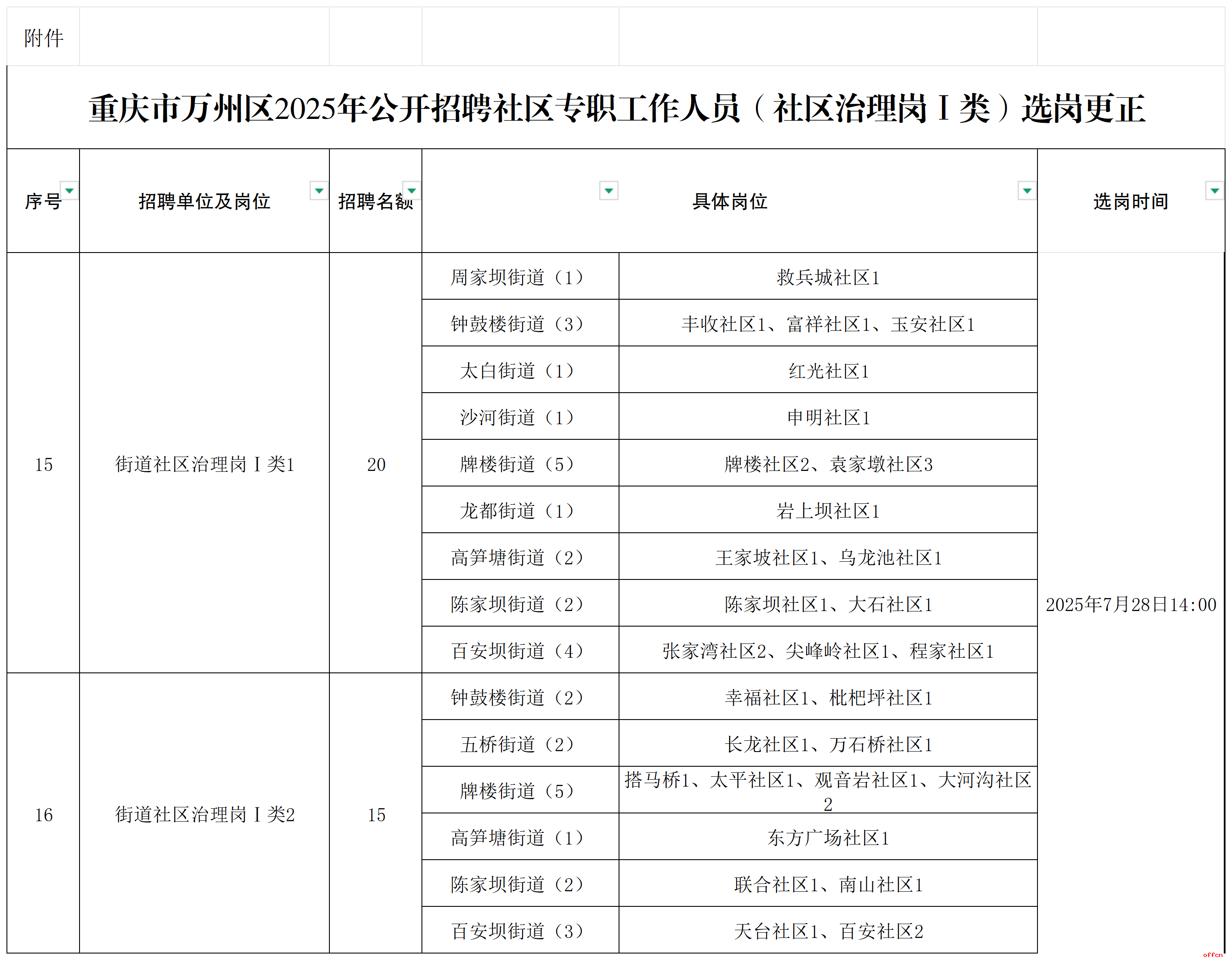原标题:关于重庆市万州区2025年公开招聘社区工作者选岗部分岗位更正的通知