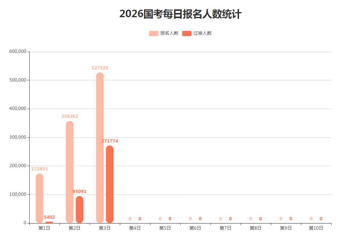 截至17日16时,2026国考报名共有527328人提交了报名申请,其中271774人通过了审核。