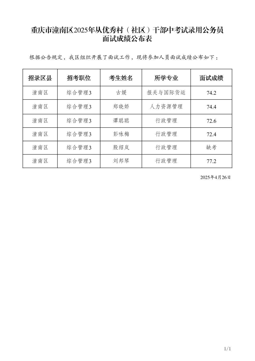 原标题:重庆市潼南区2025年从优秀村(社区)干部中考试录用公务员面试成绩公布表