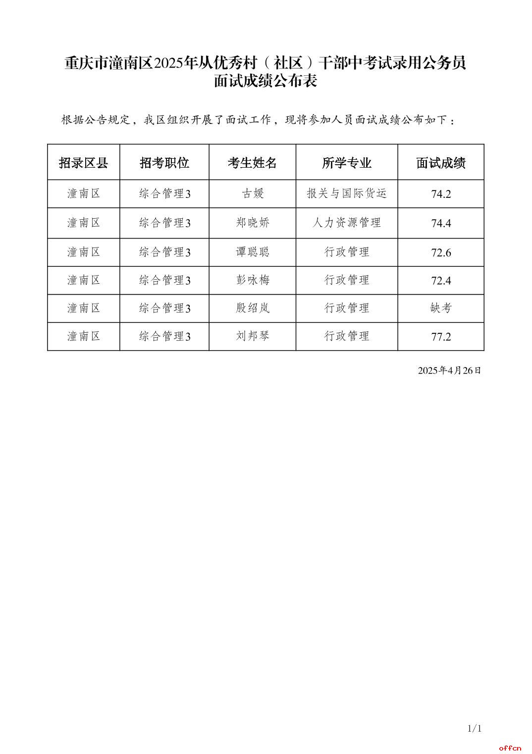 原标题:重庆市潼南区2025年从优秀村(社区)干部中考试录用公务员面试成绩公布表
