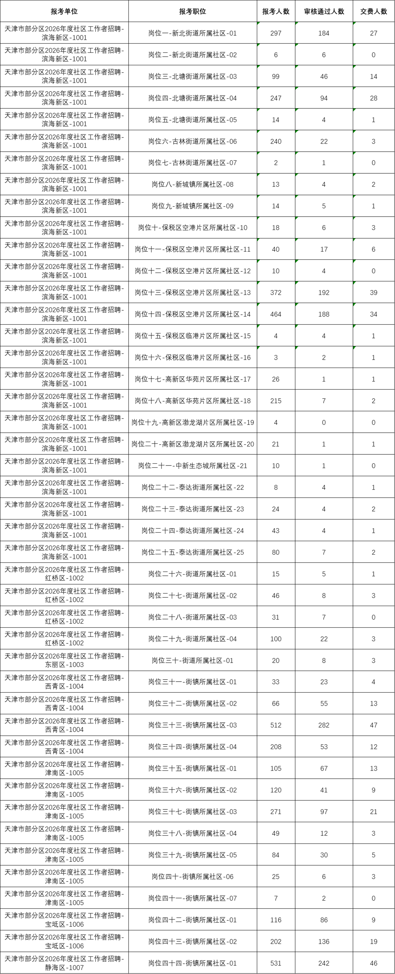 原标题:天津市部分区2026年度社区工作者招聘报考情况统计(统计时间:2026年1月22日上午10点)