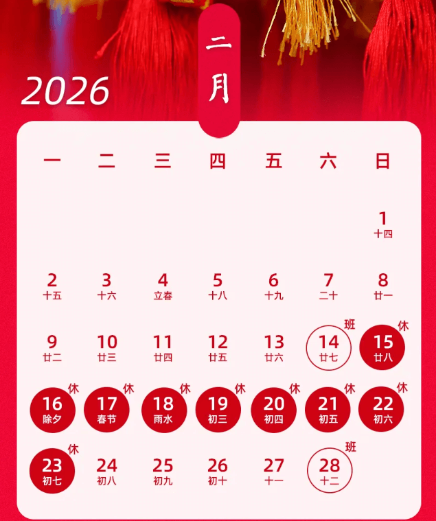 春节:2月15日(农历腊月二十八、周日)至23日(农历正月初七、周一)放假调休,共9天。2月14日(周六)、2月28日(周六)上班。高速免费时间:2月15日零点整-2月23日十二点。