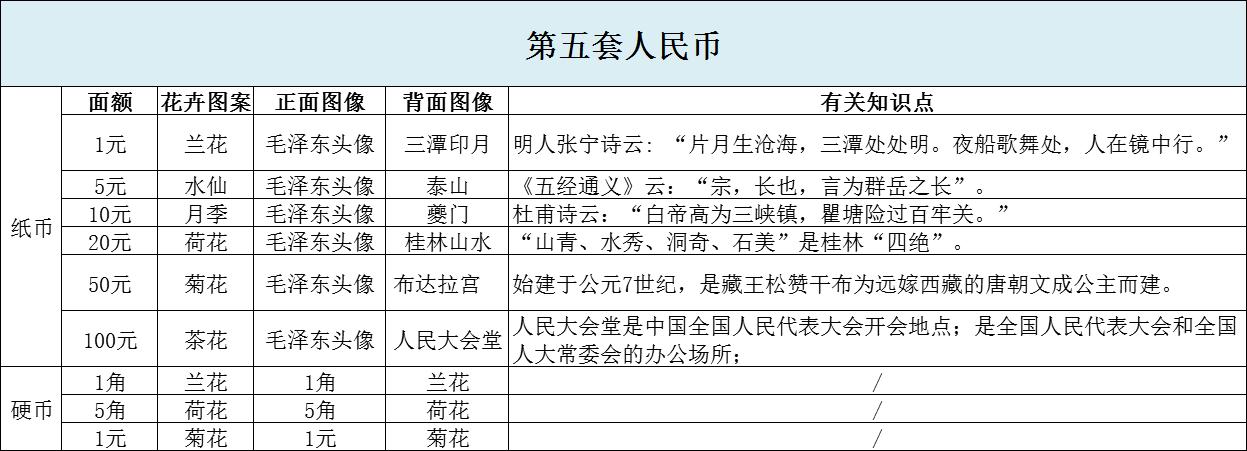 1. (单选)2005年8月31日起,中国人民银行发行2005年版( )人民币,主图案与1999版保持一致。第五套人民币共有( )种面额,其中1元有纸币、硬币2种。此套人民币取消第四套人民币里的1角、2角、5角和2元纸币,恢复了( )元面额的纸币。